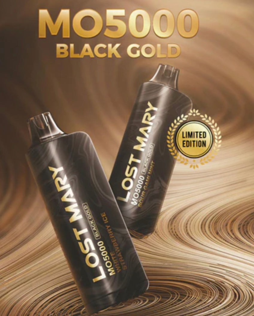Lost Mary MO5000 Black Gold Edition Disposable features a 13.5ml prefilled e-juice, rechargeable using USB-C 500mAh internal battery, 1.2ohm mesh coil for smooth delicious flavor, and a 5% nicotine strength for up to 5000 puffs.